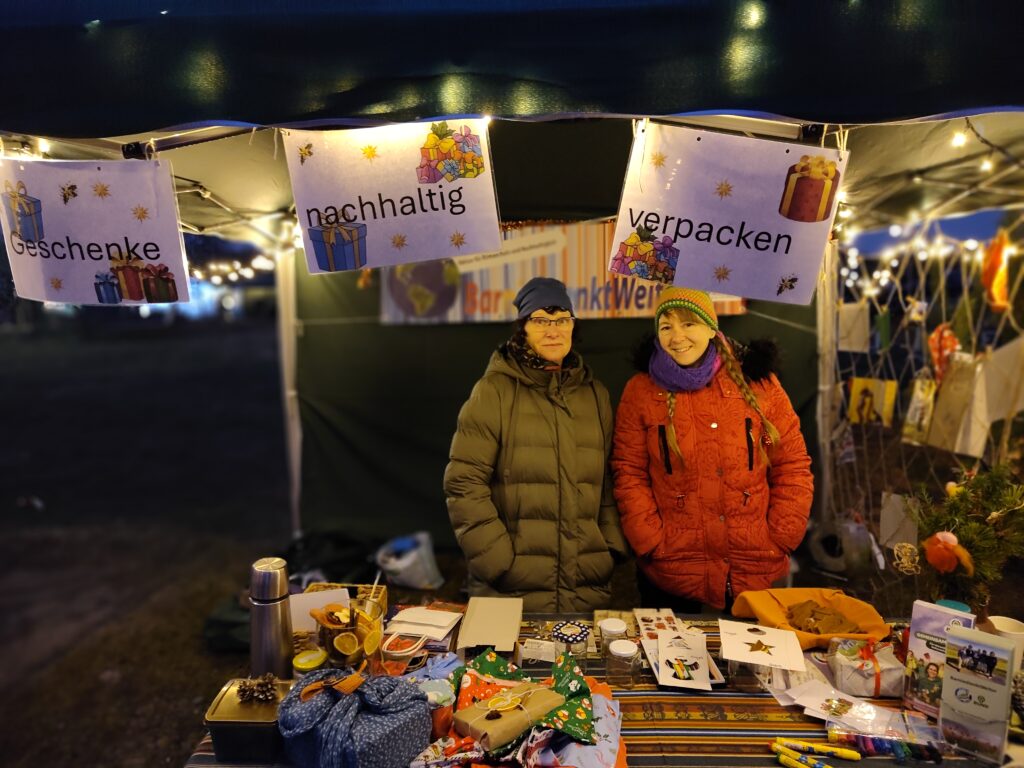 Auf dem Weihnachtsmarkt in Hobrechtsfelde am 13. Dezember 2025 drehte sich an unserem Stand alles um das Thema „Geschenke nachhaltig verpacken“. Wir hatte einige Ideen dabei: Tücher, die man nach japanischer Knottechnik zur einer attraktiven Verpackung machen konnte, selbstgenähte Säckchen, die man bemalen und dann natürlich immer wieder verwenden kann, Gläser wurden mit bunten Farben zu kleinen Geschenkedosen. Aus alten Kalenderblättern haben wir Geschenketüten gefaltet, was besonders gut ankam.