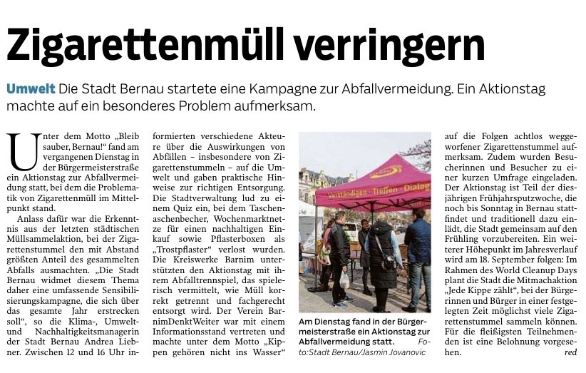 Unsere erste gemeinsame Aktion war ein Adventskalender, der über Bernau-Live erreichbar war, vielleicht erinnert sich jemand daran. Die Türchen waren mit kleinen Tipps für Nachhaltigkeit im Alltag gefüllt. Seit September 2022 sind wir Regionalgruppe beim BUND Brandenburg, somit haben wir Vereinsstatus.